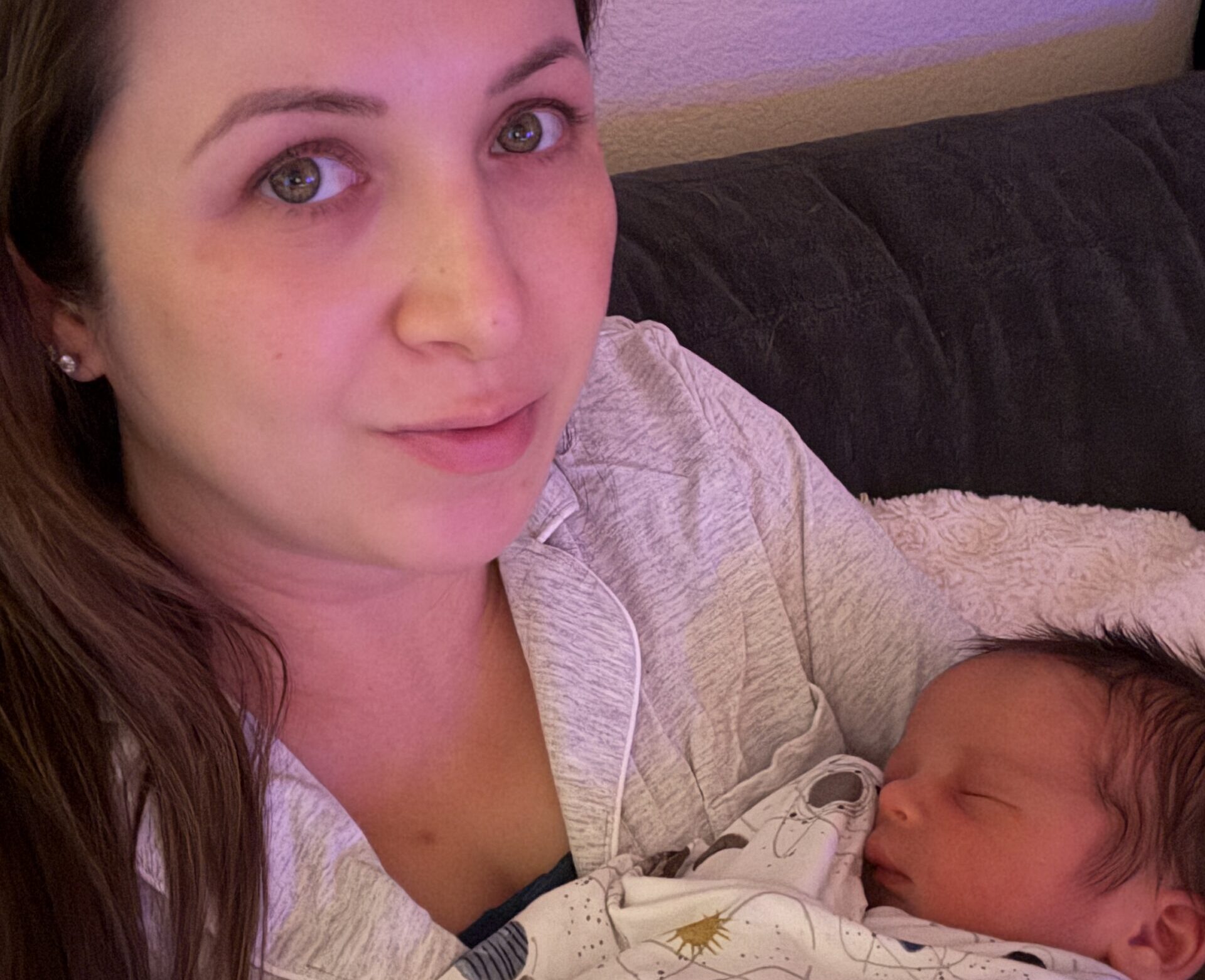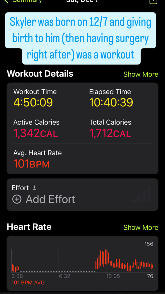 When I got to the room, they transferred me (my body was still pretty much a potato, I felt like I had no energy or control over it) to the bed for surgery and asked how I was doing. I was surprised at how many people were in there, it felt like there were 15 people. They gave me something that I think made me black out, I don’t know what it was. I just remember waking up and asking if everything went well and I was brought to a room for recovery. I was still very thirsty. They asked if I wanted Daniel and Skyler to come in and I said yes; they eventually came in (Skyler was wheeled in in a little bassinet). Daniel kept giving me water and apple juice and gave me my phone, but I don’t think I could use it (I was still mostly incoherent and violently shaking). They had me hold Skyler and try to nurse; he latched but I wasn’t producing milk (or even colostrum) yet–that took 5 days, so Skyler got formula from a tiny syringe instead. Daniel updated me on what had happened; he had gotten some skin-to-skin time with Skyler and they had gotten Skyler’s measurements (19.5” and 7 lbs 1 oz) and given him his initial vaccine and vitamins.