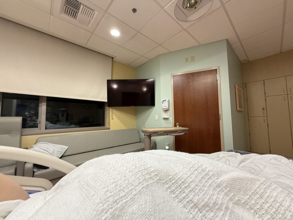 We arrived at around 2:35 AM, went through security, and checked in in the ER. The receptionist asked if I wanted a wheelchair (no) and if I wanted to sign for myself (yes) then the L&D nurse, Mary, came down to bring us upstairs. Daniel helped me change into a hospital gown, disposable underwear, and a massive pad before I got onto the triage bed where they set me up with sensors to track Skyler’s heart rate, my blood pressure, and my contractions. Daniel asked the nurse if we could keep the papers printing out showing that data for my scrapbooks and the nurses thankfully said yes. Mary asked if I had considered pain management (I was in a lot of pain at this point) and I asked what she meant; Daniel answered that I wanted an epidural. Mary asked if I wanted fentanyl to take the edge off the pain of the contractions and I hesitated for a second, felt another contraction coming, then said yes because my brain was already shorting out from the contraction pain.